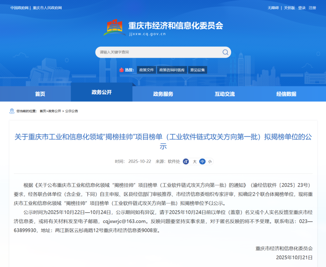 重庆市工业和信息化领域“揭榜挂帅”项目榜单(工业软件链式攻关方向第一批)揭榜单位名单