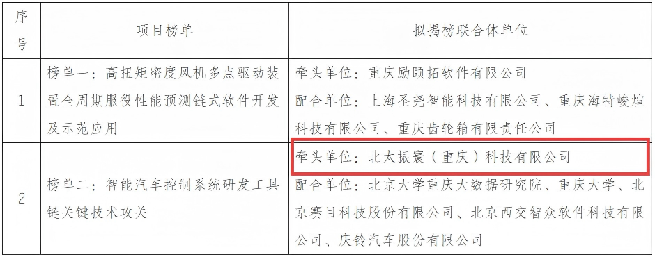 近日,重庆市经济和信息化委员会公示了工业和信息化领域“揭榜挂帅”项目榜单(工业软件链式攻关方向第一批)揭榜单位名单。北太振寰(重庆)科技有限公司(简称北太振寰)作为牵头单位参与的“智能汽车控制系统研发工具链关键技术攻关”项目成功上榜。